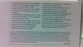 ขายMacBook Pro 15นิ้ว 2.3GHz Quard-Core turbo boost up to 3.3GHz Intel Core i7 HDD 500GB RAM 4GB Intel HD Graphics 4000/NVIDIA GeForce 650M with 512MB of memory สภาพใหม่ ใช้ครั้งเดียว(ตอนลองเครื่องที่ร้าน) สภาพ99.99% อุกรณ์ครบกล่อง ขายเนื่องจากซื้อมาสองตัว ราคา54,000บาท (ราคาสามารถลดได้ ถัาสนใจติดต่อมาเสนอราคาได้ที่ 0817511986)