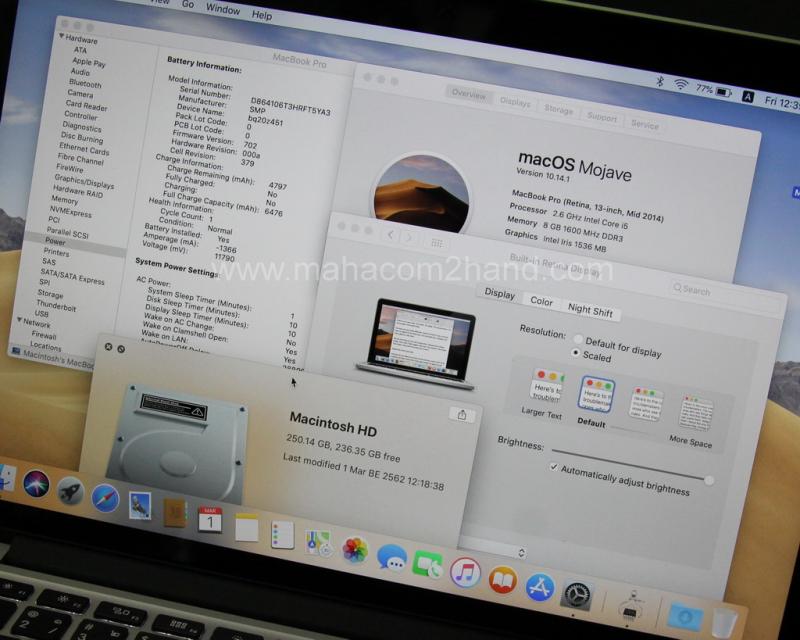 ครบยกกล่อง New Batterry MacBook Pro Retina 13 (Mid 2014 ) มาจัดให้อีกแล้วครับ มาพร้อม CPU Intel Core i5-4278U (2.60GHz, 3 MB L3 Cache, up to 2.60GHz) พร้อมด้วย RAM 8GB DDR3 1600Mhz อัดเเน่นหน่วยความจำที่ให้มาถึง 256GB Flash Storage เพียงพอต่อการจัดเก็บข้อมูลต่างๆครับพ่างด้วยการ์ดจอ Intel Iris graphics 5100 พร้อมกับขนาด 13 นิ้ว LED WXGA+ ความละเอียดที่ (2560x1600) IPS Panel Retina Display 227 ppi ภาพสวยคมชัด มาพร้อมกับ port เชื่อมต่อต่าง อาทิ เช่น port USB 3.0 จำนวน 2 พอร์ต (up to 5 Gbps) , Thunderbolt 2 ports (up to 20 Gbps) , SDXC Card slot ไว้ถ่ายโอนข้อมูลต่างๆได้อย่างรวดเร็ว ไม่ว่า จะเอาไป ดูหนัง ฟังเพลง ทำงาน ทำได้แบบสบายๆๆเลยครับ แบตยังดีเยี่ยมเลยครับ Cycle Coun เพียง 162 ครั้ง Full Charge 5545 ใช้งานได้อีกยาวนาน เป็นเครื่องนำเข้า Keyboad : Thai - Eng มีประกันร้าน 1 เดือน สำหรับมือใหม่ทีอยากได้ Mac มือสองไปใช้ รับรองว่าตัวนี้คุ้มสุดๆๆครับ ตัวเครื่องมีรอยเล็กน้อยครับ ดูได้จากรูปครับ