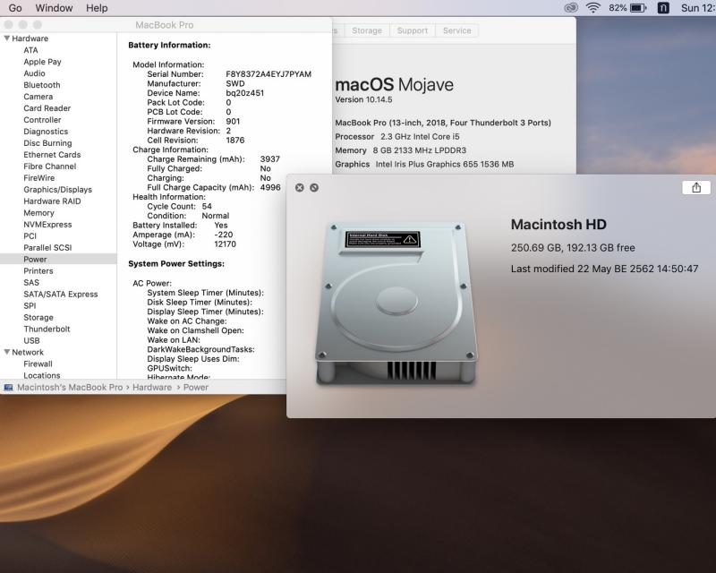 แบต Cycle แค่ 54 รอบเท่านั้น สเปคตัวเครื่องเป็น Quad-Core i5 2.3Ghz แรม 8GB SSD 256GB กราฟฟิค Iris Plus 655 (1.5GB) ตัวเครื่องน้ำหนักเบาเพยง 1.37 KG. พกพาไปไหนก็ง่าย