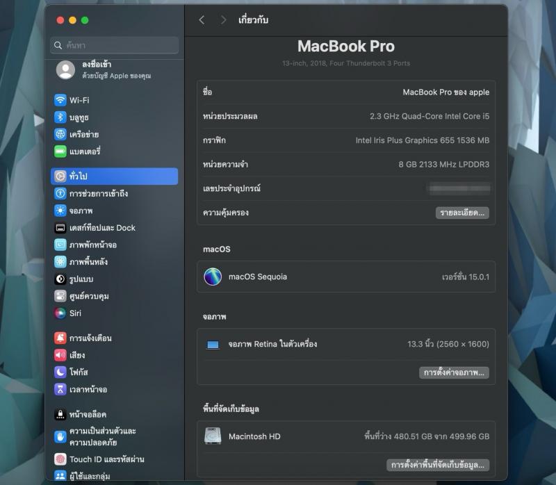 MacBook Pro (13-inch 2018 Four Thunderbolt 3 ports) Ram8gb SSD512gb SpaceGray