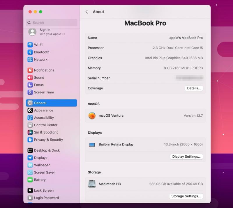 Processor : 2.3 GHz Dual-Core Intel Core i5