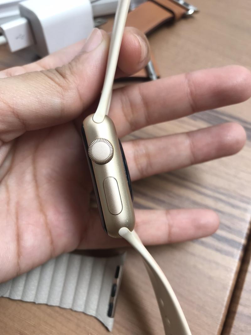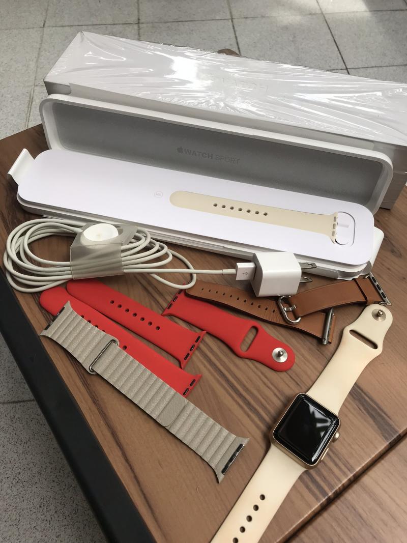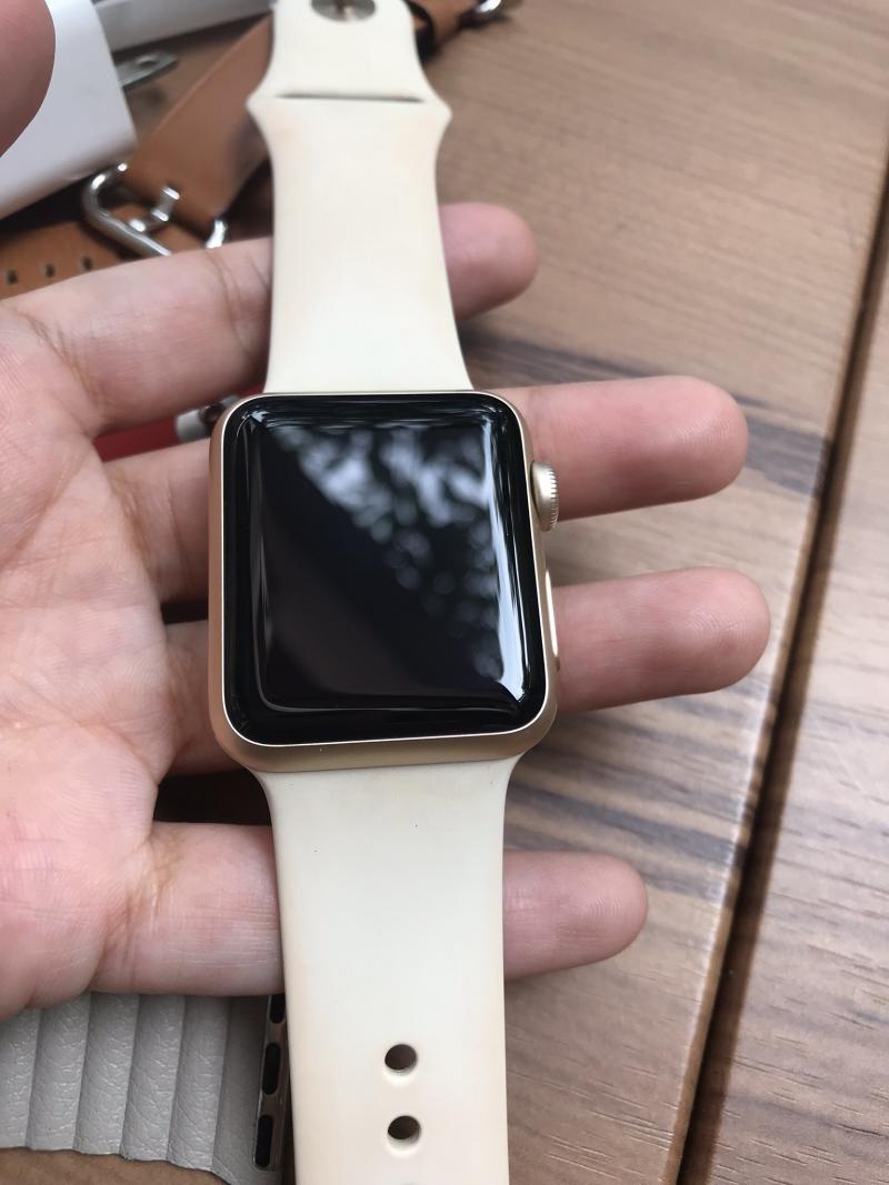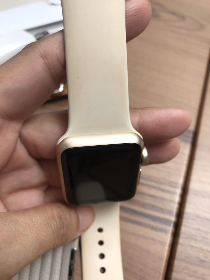 38 mm สี Gold สาย Sport สี Antique White ใช้สายS/M เป็นประจำ ส่วนสายM/Lไม่เคยใช้เก็บในซองอย่างดี กระจกไม่ได้แตกหรือร้าว ใช้งานได้เต็มทุก Function
