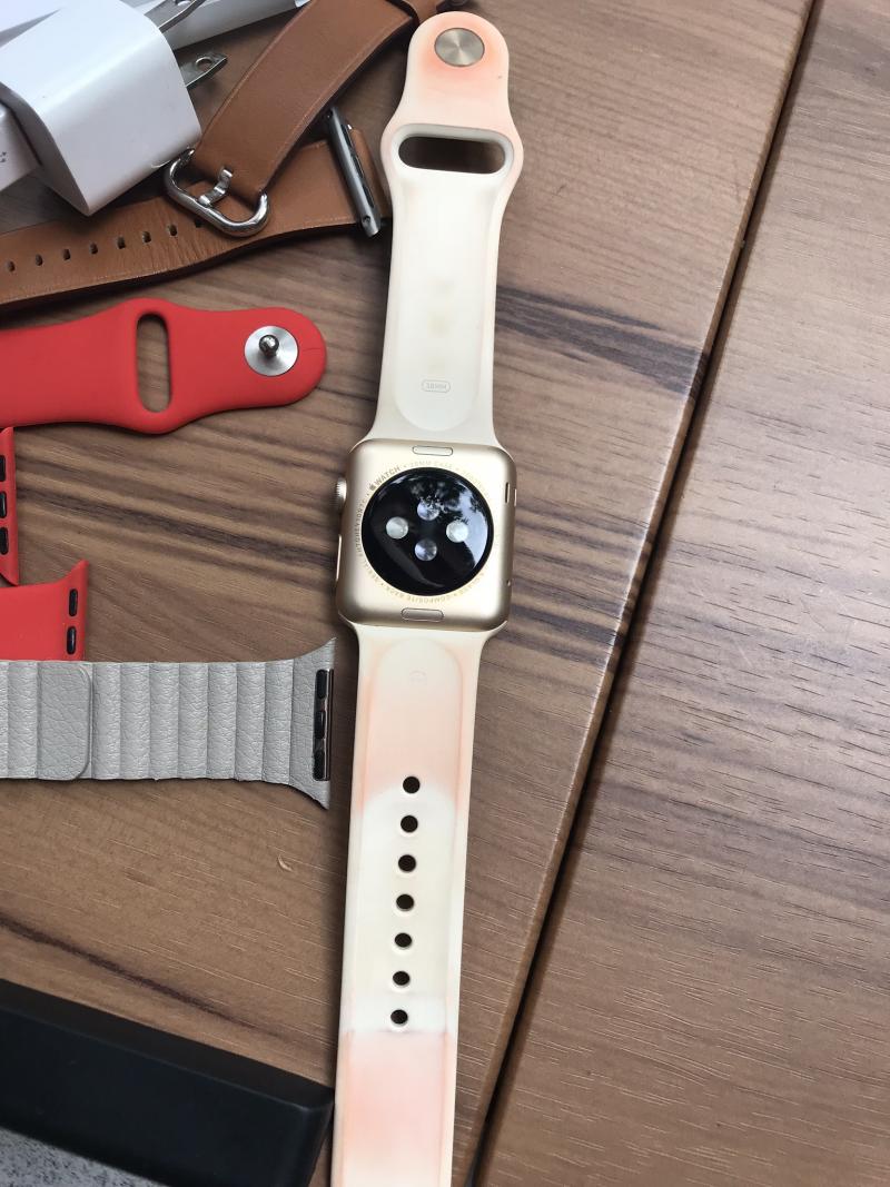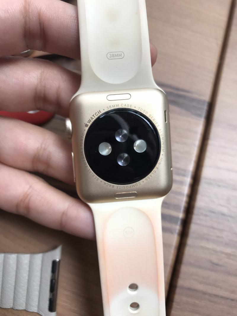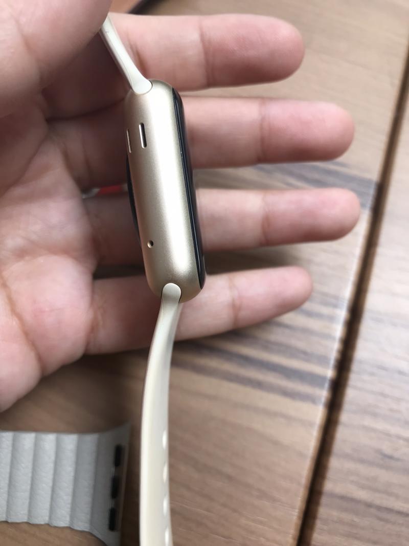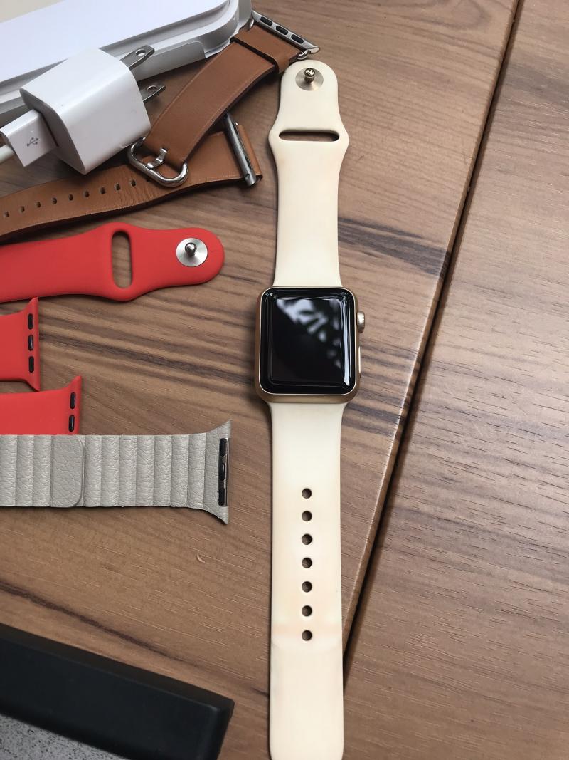 38 mm สี Gold สาย Sport สี Antique White ใช้สายS/M เป็นประจำ ส่วนสายM/Lไม่เคยใช้เก็บในซองอย่างดี กระจกไม่ได้แตกหรือร้าว ใช้งานได้เต็มทุก Function