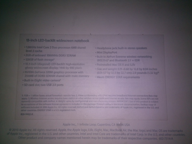 macbook air 13.3 / 1.86 GHz/2GB /128GB Flash storage รายละเอียดตามรูปแนบ อุปกรณ์ครบ-SuperDrive พร้อมกล่องเหมือนตอนซื้อครั้งแรก