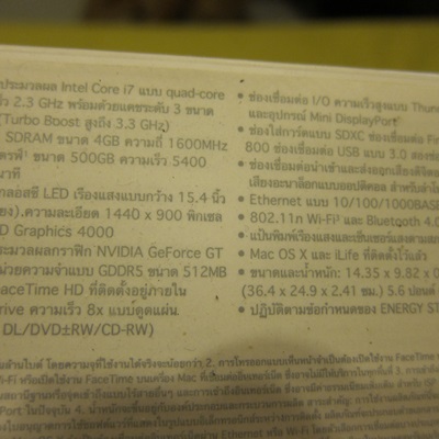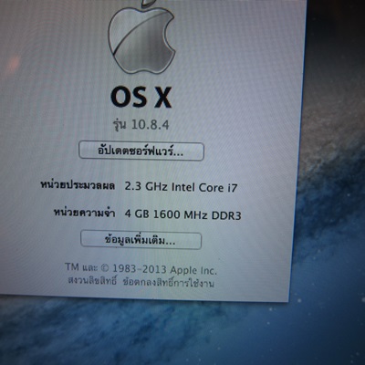 เสปคคร่าวๆนะครับ 15" 2.3 Core i7 ram4gb hdd 500 ตัวท้อปปลายปี 2012 ครับ