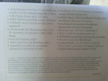 MacbookPro 13นิ้ว i7 2.9Ghz (Mid 2012) ครับ เป็นตัวล่าสุด ท้อปสุดของ13นิ้ว เครื่องสวย พร้อมใช้งาน สภาพตัวเครื่องไม่มีรอยอะไรเลย สภาพ 99% มีแรมจากศูนย์ให้ถึง 8Gb + ฟิลม์กันรอยภายในอีกประมาณ 2000 กว่าบาทของ Moshi (ที่รองมือ Trackpad และหน้าจอ) พร้อมพลาสติกใสคลุมแป้นพิมพ์และเคสอะคิลิกใสแข็งสีชมพูราคา 1,500 กว่าบาทจากช้อป Apple ด้วยครับ (ประกันเหลือน้อยนิดครับ)