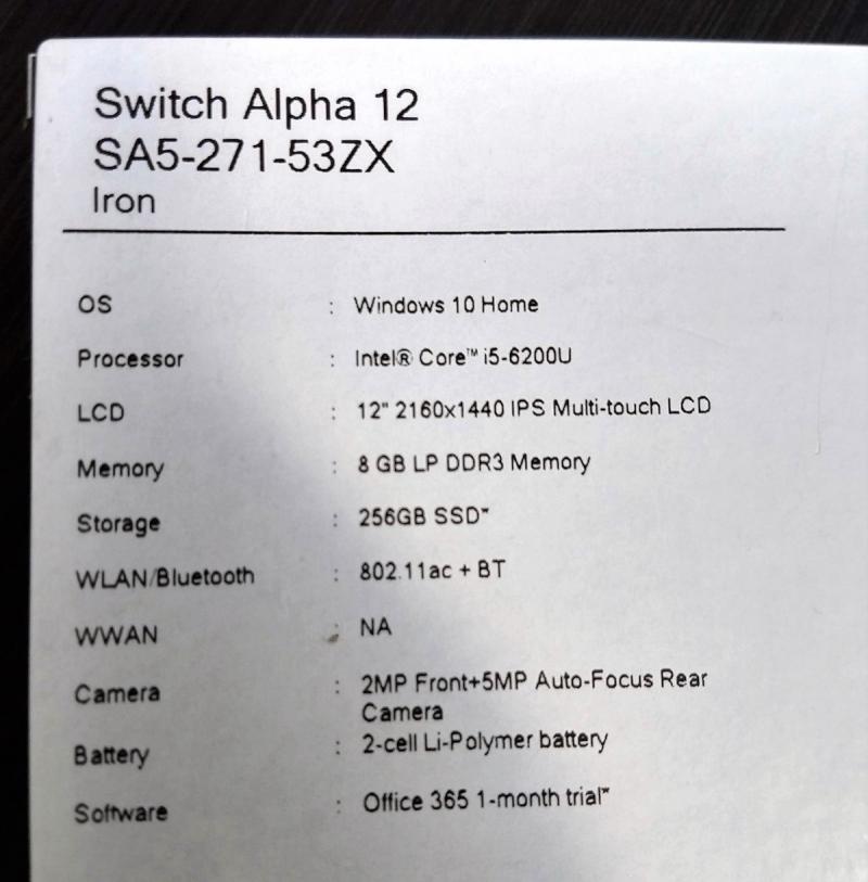 ... ขาย Acer Switch Alpha 12 Core i5 Gen6 Ram 8g SSD 256g จอทัช 12นิ้ว 2k พร้้อมปากกา ยกกล่อง ประกันเกือบปี Notebook & Tablet สไตล์ Surface