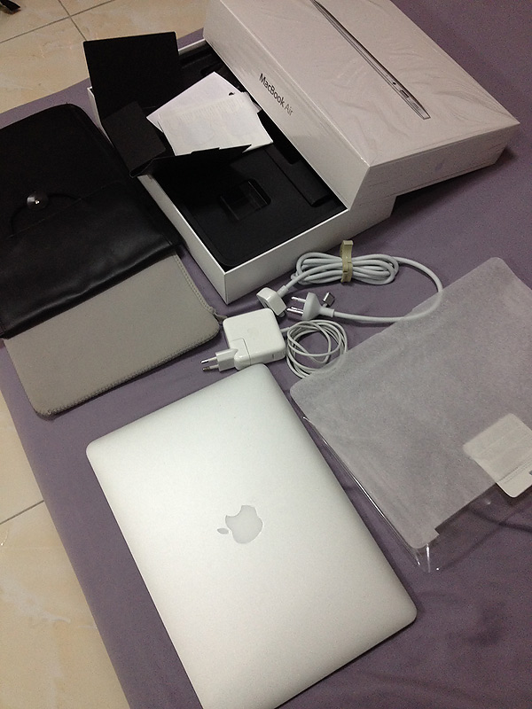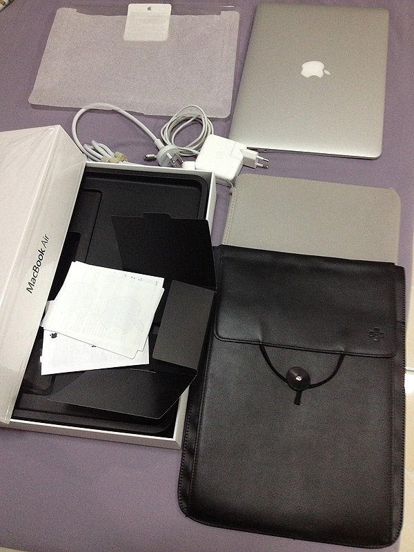 อุปกรณ์ครบ กล่อง คู่มือ สติ๊กเกอร์appleยังอยู่ สายชาร์จ แถมกระเป๋าหนังสไตล์เอกสาร และซองผ้าCote&Ciel ติดกันรอยรอบตัวทั้งฝาเครื่อง ใต้เครื่อง ที่รองมือตรงคีย์บอร์ด