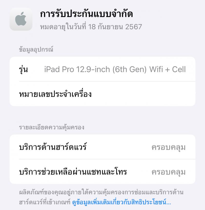 เข้าศูนย์ไทยได้ ประกัน ศูนย์ อุปกรณ์ สภาพใหม่ สามารถต่อ Apple Care + เพิ่มได้ครับ