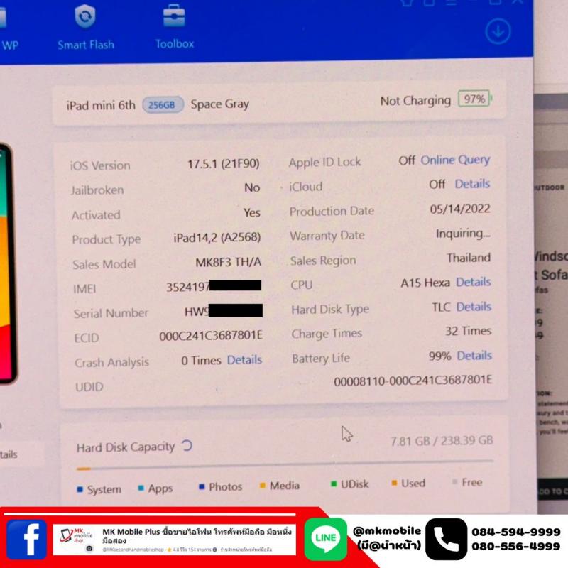 >>> Ipad Mini 6 256GB Wifi Cellular สี Gray ศูนย์ไทย สภาพนางฟ้า รอบชาร์จเพียว 32 ครั้ง แบต 100% มีเครื่องกับชุดชารจ เพียง 17990