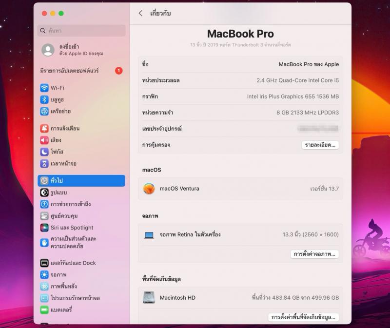 MacBook Pro (13-inch 2019 Four Thunderbolt 3 ports) Ram8gb SSD512gb SpaceGray