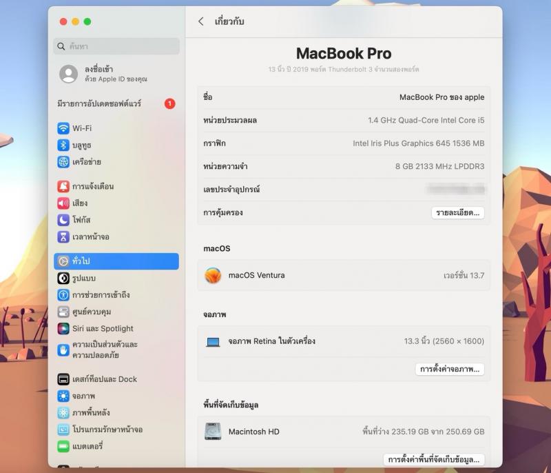 MacBook Pro (13-inch 2019 Two Thunderbolt 3 ports) Ram8gb SSD256gb SpaceGray