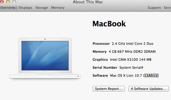 Current specs: 2.4Ghz intel core 2 Duo, 200 GB hard drive, 4GB 4 GB 667 MHz DDR2 SDRAM (max), wifi, bluetooth, combo drive (stock), isight camera, built in mic, in/out mic, HDMI adapter for tv/screen hookup, Firewire, Ethernet port, 2 USB port. IOS 10.7, Intel GMA X3100 144 MB, wifi 802.11 a/b/g/n